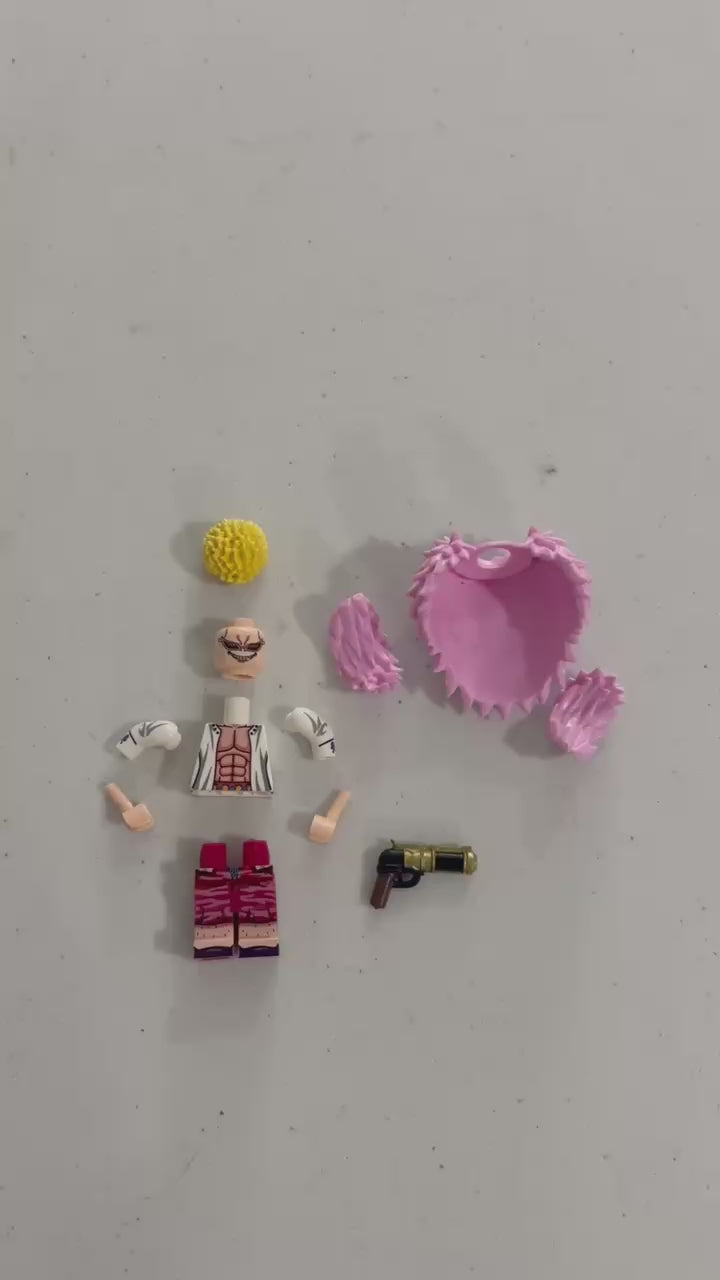 The custom Doflamingo minifigure brings the infamous villain from One Piece to life with stunning detail. Featuring a custom full-body print, vibrant hair piece, his signature pink cloak, and gun accessory, this figure captures Doflamingo's menacing personality. With LEGO compatibility, it seamlessly integrates into any collection. Perfect for fans and collectors alike, this figure is a must-have addition to your One Piece collection. Whether displayed proudly or gifted to a fellow fan, it’s an unforgettable representation of the charismatic yet dangerous character, Doflamingo.
